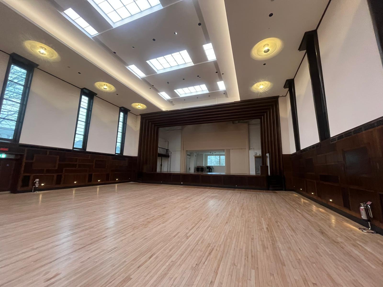 The assembly hall conversion showcased innovative space optimisation, with a full-height wall creating four usable areas while preserving original sprung floor mechanisms for potential future restoration. Event infrastructure was designed for phased growth, with motorised ceiling hooks and strengthened supports enabling professional productions.